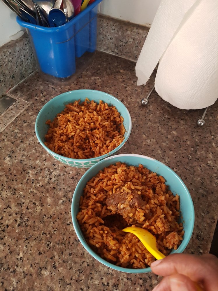 Like most children when I was young, it was tough getting me to eat. So my mum (and my aunt assigned to take care of me) would come up with many ploys to get me to eat up. This was one of their tricks. They told me I didn’t get to eat my protein until I had finished all the carbs. And because they didn’t want to have to go dish out the meat separately they would hide it at the bottom of the pile. I just caught myself hiding meat at the bottom of my children’s bowl of jollof rice and burst out laughing.